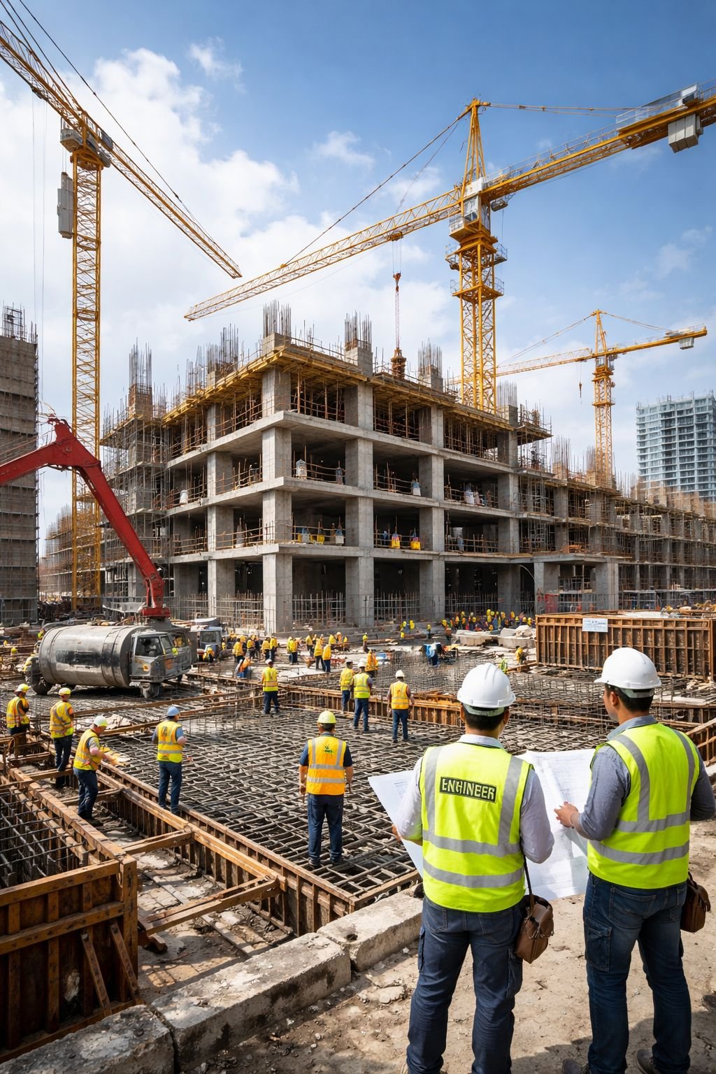 Foundations, structural works, concrete, masonry, block work, plastering, and interior fit-out for commercial, industrial, and residential projects