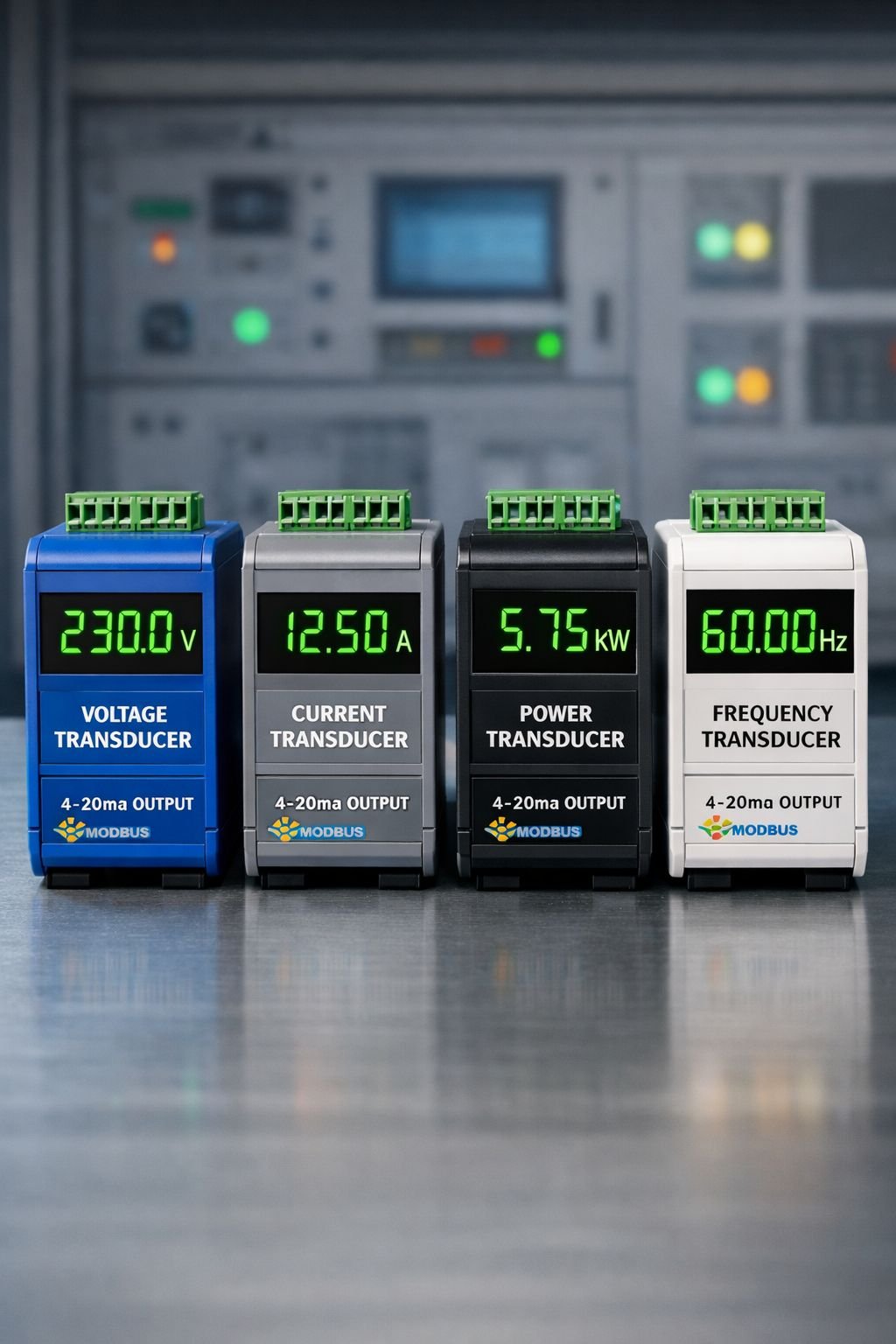 Voltage, current, power, frequency, and multi-function transducers with 4–20 mA output and MODBUS communication.