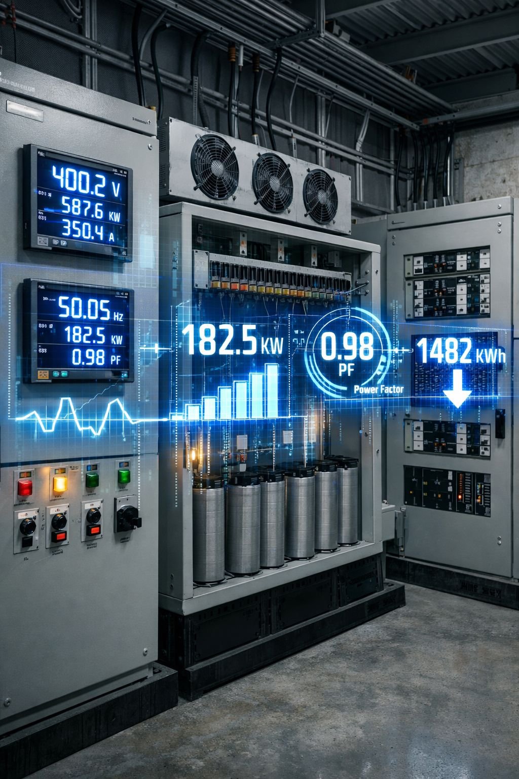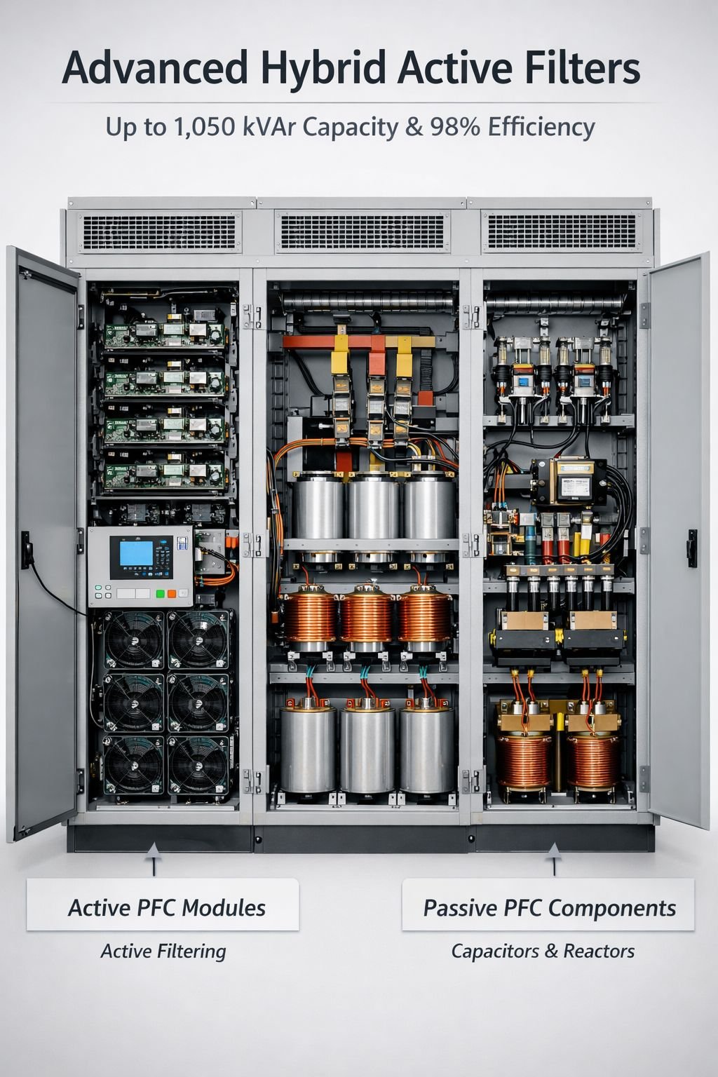 Hybrid Active Filters combining active and passive power factor correction — up to 1,050 kVAr and 98% efficiency.