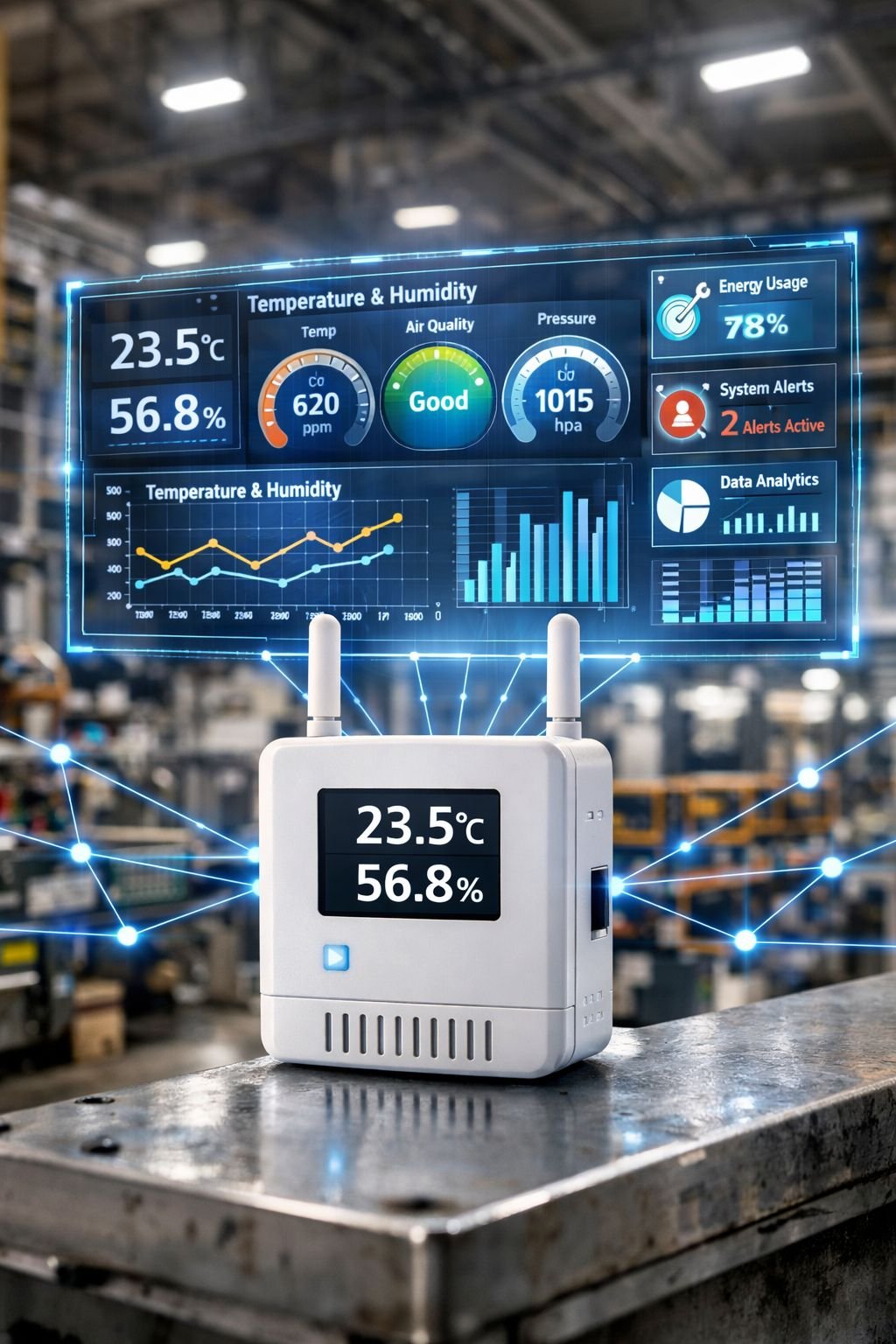 Wireless IoT sensors collect real-time data from your environment — temperature, humidity, energy, flow, and more.